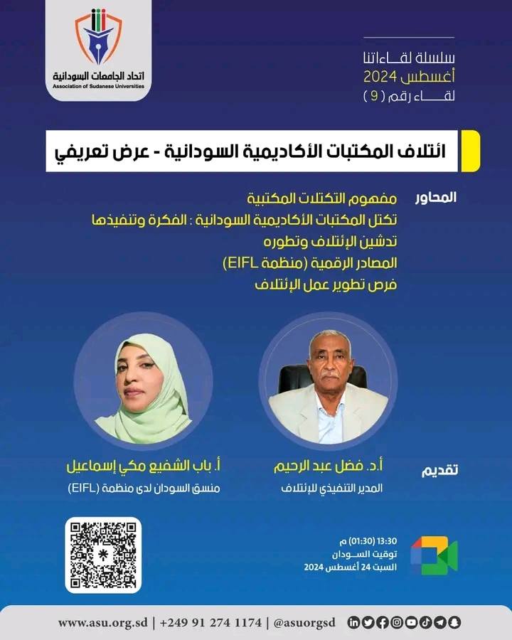 - مفهوم التكتلات المكتبية - تكتل المكتبات الأكاديمية السودانية : الفكرة وتنفيذها - تدشين الإئتلاف وتطوره - المصادر الرقمية منظمة ( EIFL ) - فرص تطوير عمل الإئتلاف